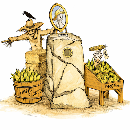 A garden or field-edge scene with barrels, planters, or produce displays that come to life through sound, motion, or light.