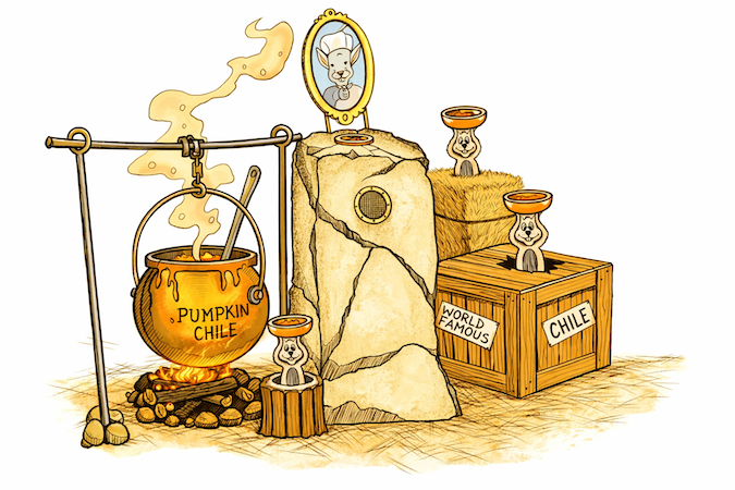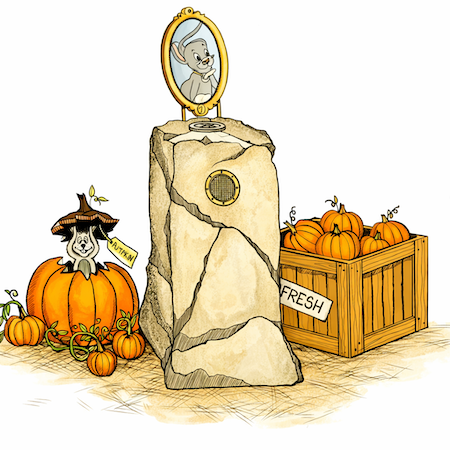 A playful farm stand or porch area where colorful treats, props, and lighthearted details hint at fall favorites and fun.