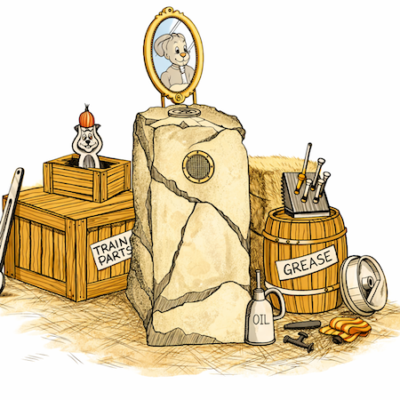 A rustic path near a train, tractor, or wagon area, filled with mechanical sounds and motion that bring the working farm to life.